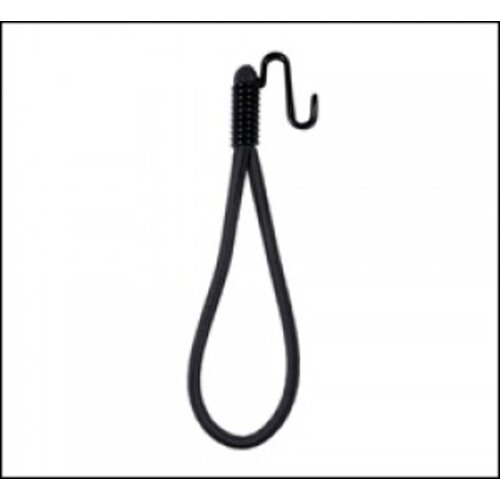 Tensioning rubber with gooseneck for attaching tarpaulin or banner between tubular frame.